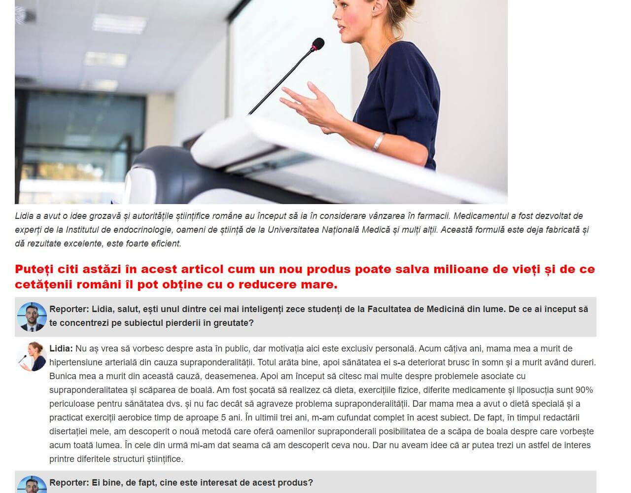 „Am fost mereu supraponderală și complexată. Nu reușeam să slăbesc, maxim 5 kilograme pierdeam din toate eforturile mele, credeam că constituția mea era așa și nu avea rost să fac nimic. Reubed mine KetoExpert pentru pierderea în greutate. Am cumpărat-o pe recenziile bune ale unei cunoștințe reale, mama ei a pierdut 20 de kilograme cu aceste capsule. Și eu aveam nevoie de un astfel de efect, așa că am cumpărat-o. A luat un curs de 60 de zile, sa simțit minunat în această perioadă și, cel mai important, rezultatul nu a dezamăgit - a pierdut 21 de kilograme. În cele din urmă, am devenit o persoană diferită, am încetat să mă simt conștient de figura mea și am crescut activitatea motorie. Am trăit la noua mea greutate timp de șase luni - nu a revenit. Este un remediu foarte bun.