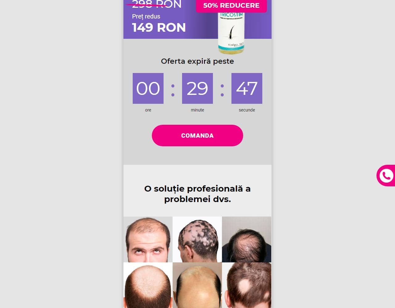 Important: Pentru rezidenții din România, vă informăm că puteți achiziționa Tricostim în condiții mai avantajoase, deoarece ofertele promoționale sunt supuse restricțiilor teritoriale. Răspunsuri la întrebări despre posibilitatea de a cumpăra Tricostim în lanțurile de farmacii, precum și despre prețul produsului, luând în considerare reducerile, veți primi în timpul unei consultații telefonice. Ați cumpărat un produs de calitate scăzută? Anunțați reprezentanții, iar în termen de 1 săptămână veți primi o înlocuire sau o rambursare.
